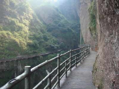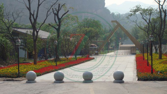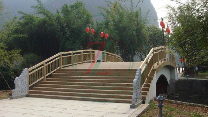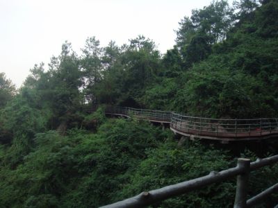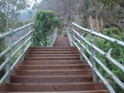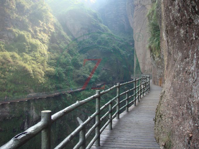 本項目位于龍虎山桃花洲景區,工程內容包括景門、涼亭、橋、園路、廁所等園林景觀建設工程。龍虎山登山棧道為懸挑結構,施工難度較大。施工所用仿木棧道不但結構牢固,而且自然美觀,質感色澤協調,達到良好的景觀效果。