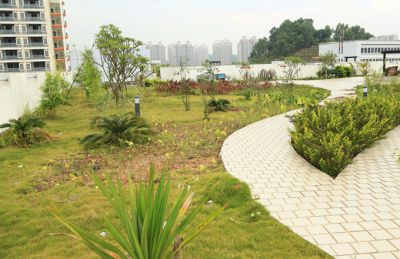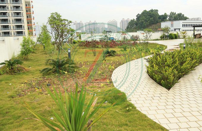 作為深圳市綠色建筑的示范工程,深圳高級技工學(xué)校新校區(qū)的建設(shè)大量應(yīng)用了節(jié)能、節(jié)水、節(jié)材和環(huán)境保護等技術(shù)措施,其中包括屋頂花園的建設(shè)。其厚厚的種植土層可以有效隔絕室外的噪音和振動對教室的影響,同時起到隔熱和過濾收集屋頂雨水的作用。大面積的屋頂花園成為教學(xué)樓和生活區(qū)之間的活動場所,彌補了校園內(nèi)稀缺的平面活動場所。