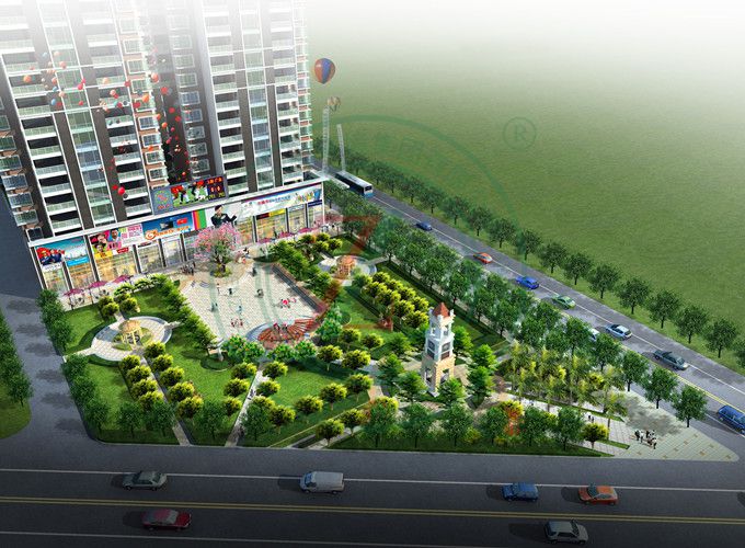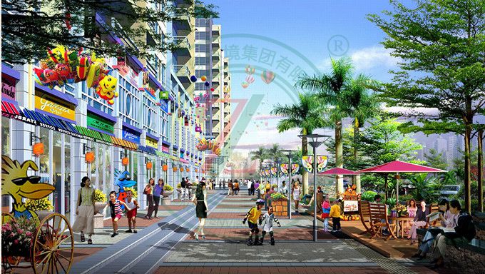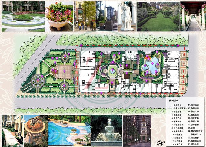 設計理念:本設計借鑒歐洲古典庭院景觀設計手法,將歐洲貴族的品質生活帶到本項目中。根據項目空間不同功能的劃分,主要將景觀分為三塊景觀空間:一是采用歐式對稱的造園手法形成的市民文化活動場地的公園廣場區;二是供市民消費娛樂的商業街區;三是運用一步一景的精致景觀設計理念,提供僅僅住戶使用的景觀庭院區。設計風格為古典與現代相結合。