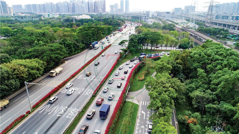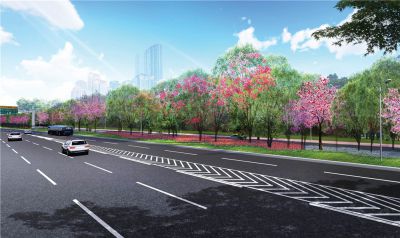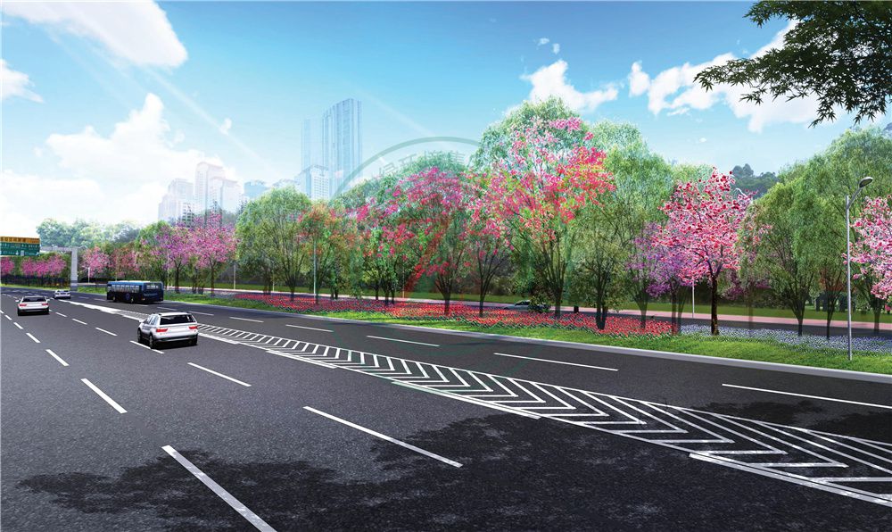 北環(huán)大道西起深南北環(huán)立交橋,東止銀湖立交,呈現(xiàn)山林段與都市段相互穿插的城市景觀空間。設計以“綠樹青山葉凝萃,姹紫嫣紅總是春”為主題,以開閉有致、疏朗通透為基調(diào),強調(diào)自然生存、多元并存,將北環(huán)大道打造成一條四季郁郁蔥蔥,春天花開燦爛的山林生態(tài)景觀大道。